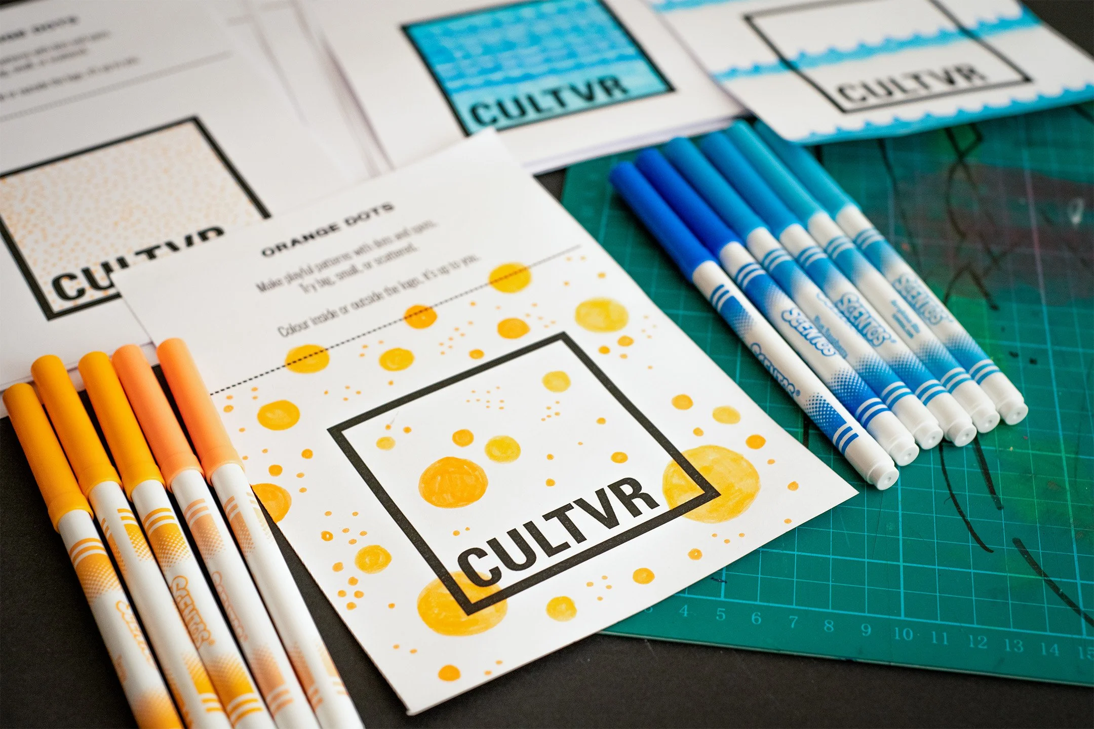A set of simple rules guided the workshop, participants could choose either orange circles or blue waves, and colour inside or outside the logo. These clear constraints created freedom rather than limitation, giving people enough structure to feel confident, and enough space to be themselves without getting lost in possibilities.